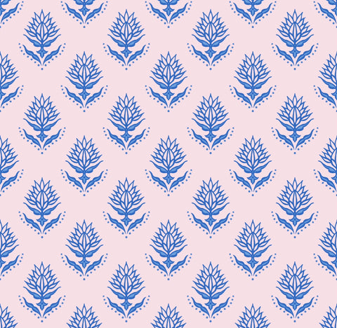 Pale pink cotton boxer shorts emblazoned with a blue botanical design