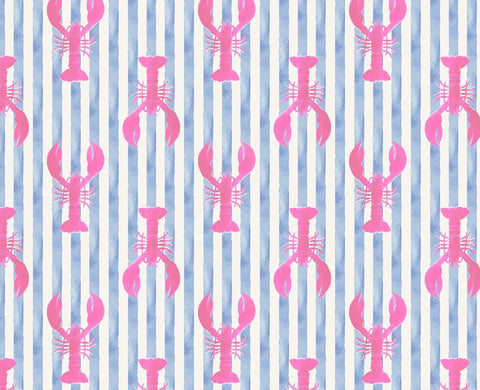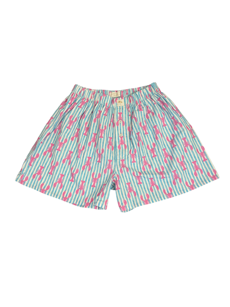 Cotton Boxer shorts with a blue and white stripe with a pink lobster design.